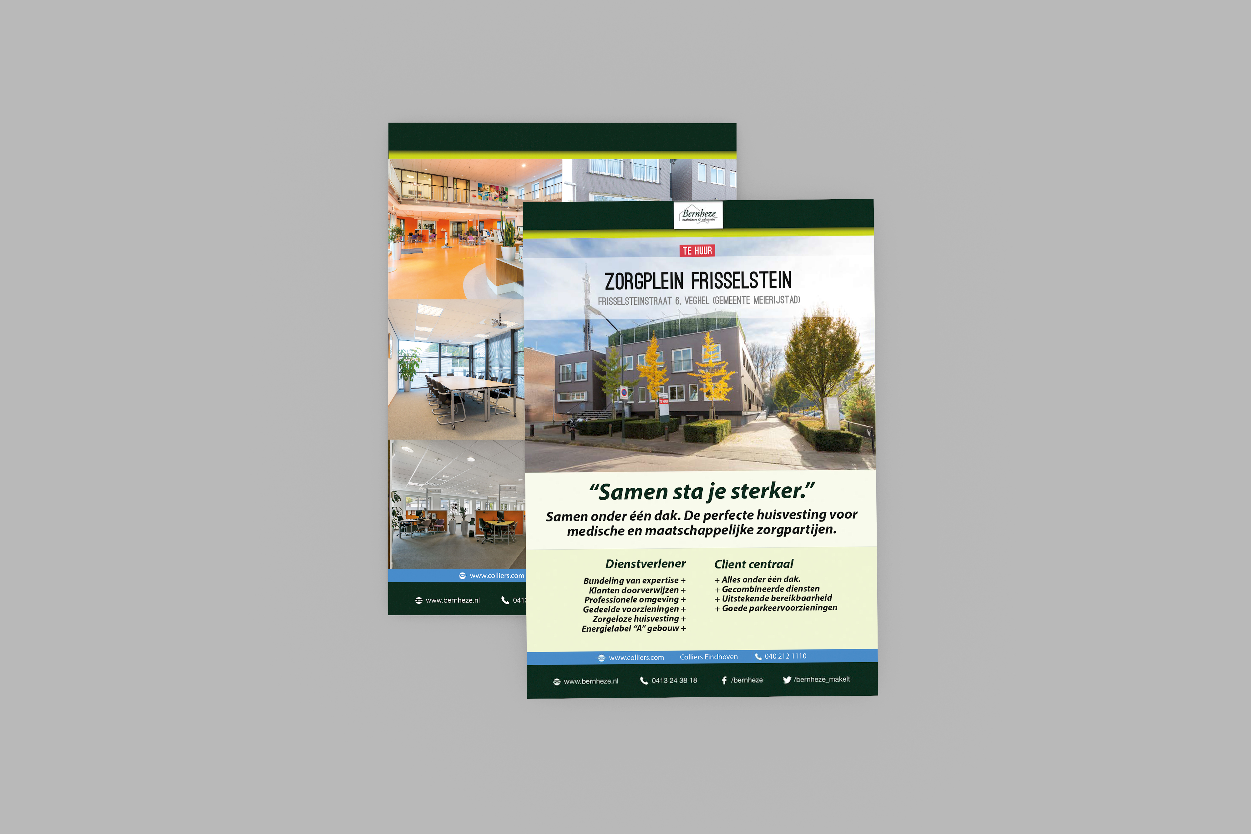 Bernheze Makelaars approached us for a full-stack rebranding of their corporate identity that has been a solid icon for 20 years. Initially, we set up a branding trajectory with the management team to tackle this with structure. We started with the original identity, vision/mission and core values of Bernheze Makelaars - illustrating their position in the market and the brand status that they want to establish. After a couple of sessions of brand archetyping, we determined that the brand of Bernheze Makelaars best matched "the ruler": without any fancy marketing, the brand should communicate the essence – experience, quality of service and authority. Secondly, we initiated corporate identity sessions to collect the ingredients for a new visual appearance. By using style frames and by collecting feedback on multiple iterations, we came to a final logo. Also, we summarized all new visual guidelines such as brand colors, typography, iconography and usage of images in a Brandbook. This brandbook has marked the milestone of a great co-creative process of setting up the new brand's boundaries and conditions. With these in mind, we applied the new visual style and designed several products such as their important "for sale" signs, business cards, stationary, presentation kits, roll-up banners and flyers.